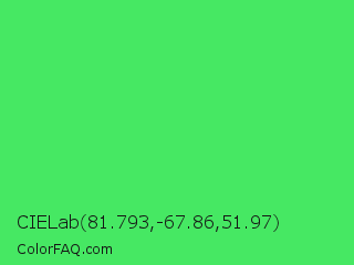 CIELab 81.793,-67.86,51.97 Color is a normal green color and the nearest color is UFO Green #3cd070. Hex code #46e863 and RGB value is rgb(70,232,99). In RGB color space, this color is composed of 27% red, 91% green, 39% blue, In CMYK color space, this color is composed of 70% cyan, 0% magenta, 57% yellow , 9% black , In HSL color space, this color has a hue angle of 131° , 78% saturation and 59% lightness.