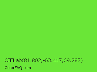 CIELab 81.802,-63.417,69.287 Color is a normal green color and the nearest color is Kiwi #8ee53f. Hex code #6ae637 and RGB value is rgb(106,230,55). In RGB color space, this color is composed of 42% red, 90% green, 22% blue, In CMYK color space, this color is composed of 54% cyan, 0% magenta, 76% yellow , 10% black , In HSL color space, this color has a hue angle of 103° , 78% saturation and 56% lightness.