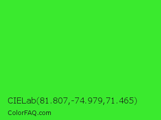 CIELab 81.807,-74.979,71.465 Color is a normal green color and the nearest color is Lime Green #32cd32. Hex code #3aea2e and RGB value is rgb(58,234,46). In RGB color space, this color is composed of 23% red, 92% green, 18% blue, In CMYK color space, this color is composed of 75% cyan, 0% magenta, 80% yellow , 8% black , In HSL color space, this color has a hue angle of 116° , 82% saturation and 55% lightness.