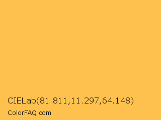 CIELab 81.811,11.297,64.148 Color is a light orange color and the nearest color is Saffron Mango #f9bf58. Hex code #ffc14e and RGB value is rgb(255,193,78). In RGB color space, this color is composed of 100% red, 76% green, 31% blue, In CMYK color space, this color is composed of 0% cyan, 24% magenta, 69% yellow , 0% black , In HSL color space, this color has a hue angle of 39° , 100% saturation and 65% lightness.