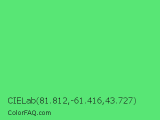 CIELab 81.812,-61.416,43.727 Color is a light green color and the nearest color is Very Light Malachite Green #64e986. Hex code #58e675 and RGB value is rgb(88,230,117). In RGB color space, this color is composed of 35% red, 90% green, 46% blue, In CMYK color space, this color is composed of 62% cyan, 0% magenta, 49% yellow , 10% black , In HSL color space, this color has a hue angle of 132° , 74% saturation and 62% lightness.