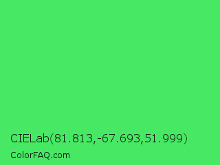 CIELab 81.813,-67.693,51.999 Color is a normal green color and the nearest color is UFO Green #3cd070. Hex code #47e863 and RGB value is rgb(71,232,99). In RGB color space, this color is composed of 28% red, 91% green, 39% blue, In CMYK color space, this color is composed of 69% cyan, 0% magenta, 57% yellow , 9% black , In HSL color space, this color has a hue angle of 130° , 78% saturation and 59% lightness.