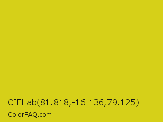 CIELab 81.818,-16.136,79.125 Color is a normal yellow color and the nearest color is Bird Flower #d4cd16. Hex code #d6d118 and RGB value is rgb(214,209,24). In RGB color space, this color is composed of 84% red, 82% green, 9% blue, In CMYK color space, this color is composed of 0% cyan, 2% magenta, 89% yellow , 16% black , In HSL color space, this color has a hue angle of 58° , 80% saturation and 47% lightness.