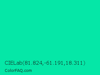 CIELab 81.824,-61.191,18.311 Color is a normal green color and the nearest color is Medium Spring Green #00fa9a. Hex code #05e7a7 and RGB value is rgb(5,231,167). In RGB color space, this color is composed of 2% red, 91% green, 65% blue, In CMYK color space, this color is composed of 98% cyan, 0% magenta, 28% yellow , 9% black , In HSL color space, this color has a hue angle of 163° , 96% saturation and 46% lightness.