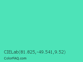 CIELab 81.825,-49.541,9.52 Color is a normal green color and the nearest color is Eucalyptus #44d7a8. Hex code #4de3b8 and RGB value is rgb(77,227,184). In RGB color space, this color is composed of 30% red, 89% green, 72% blue, In CMYK color space, this color is composed of 66% cyan, 0% magenta, 19% yellow , 11% black , In HSL color space, this color has a hue angle of 163° , 73% saturation and 60% lightness.