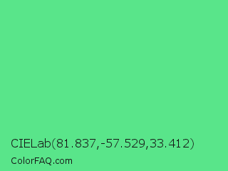 CIELab 81.837,-57.529,33.412 Color is a light green color and the nearest color is Very Light Malachite Green #64e986. Hex code #59e58a and RGB value is rgb(89,229,138). In RGB color space, this color is composed of 35% red, 90% green, 54% blue, In CMYK color space, this color is composed of 61% cyan, 0% magenta, 40% yellow , 10% black , In HSL color space, this color has a hue angle of 141° , 73% saturation and 62% lightness.
