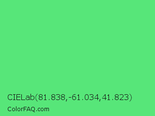 CIELab 81.838,-61.034,41.823 Color is a light green color and the nearest color is Very Light Malachite Green #64e986. Hex code #57e679 and RGB value is rgb(87,230,121). In RGB color space, this color is composed of 34% red, 90% green, 47% blue, In CMYK color space, this color is composed of 62% cyan, 0% magenta, 47% yellow , 10% black , In HSL color space, this color has a hue angle of 134° , 74% saturation and 62% lightness.