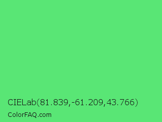 CIELab 81.839,-61.209,43.766 Color is a light green color and the nearest color is Very Light Malachite Green #64e986. Hex code #59e675 and RGB value is rgb(89,230,117). In RGB color space, this color is composed of 35% red, 90% green, 46% blue, In CMYK color space, this color is composed of 61% cyan, 0% magenta, 49% yellow , 10% black , In HSL color space, this color has a hue angle of 132° , 74% saturation and 63% lightness.