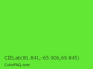 CIELab 81.841,-65.906,69.845 Color is a normal green color and the nearest color is Kiwi #8ee53f. Hex code #62e735 and RGB value is rgb(98,231,53). In RGB color space, this color is composed of 38% red, 91% green, 21% blue, In CMYK color space, this color is composed of 58% cyan, 0% magenta, 77% yellow , 9% black , In HSL color space, this color has a hue angle of 105° , 79% saturation and 56% lightness.