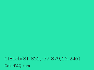 CIELab 81.851,-57.879,15.246 Color is a normal green color and the nearest color is Turquoise PWG #30d5c8. Hex code #26e6ad and RGB value is rgb(38,230,173). In RGB color space, this color is composed of 15% red, 90% green, 68% blue, In CMYK color space, this color is composed of 83% cyan, 0% magenta, 25% yellow , 10% black , In HSL color space, this color has a hue angle of 162° , 79% saturation and 53% lightness.