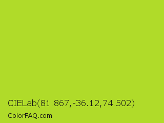 CIELab 81.867,-36.12,74.502 Color is a normal lime color and the nearest color is Inch Worm #b0e313. Hex code #b0db29 and RGB value is rgb(176,219,41). In RGB color space, this color is composed of 69% red, 86% green, 16% blue, In CMYK color space, this color is composed of 20% cyan, 0% magenta, 81% yellow , 14% black , In HSL color space, this color has a hue angle of 74° , 71% saturation and 51% lightness.
