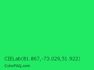 CIELab 81.867,-73.029,51.922 Color is a normal green color and the nearest color is Malachite #0bda51. Hex code #20ea63 and RGB value is rgb(32,234,99). In RGB color space, this color is composed of 13% red, 92% green, 39% blue, In CMYK color space, this color is composed of 86% cyan, 0% magenta, 58% yellow , 8% black , In HSL color space, this color has a hue angle of 140° , 83% saturation and 52% lightness.
