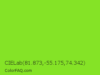 CIELab 81.873,-55.175,74.342 Color is a normal green color and the nearest color is Kiwi #8ee53f. Hex code #85e326 and RGB value is rgb(133,227,38). In RGB color space, this color is composed of 52% red, 89% green, 15% blue, In CMYK color space, this color is composed of 41% cyan, 0% magenta, 83% yellow , 11% black , In HSL color space, this color has a hue angle of 90° , 77% saturation and 52% lightness.