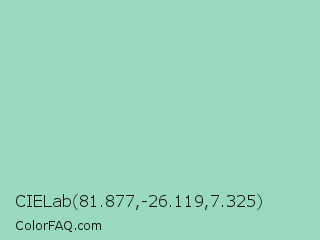 CIELab 81.877,-26.119,7.325 Color is a light green color and the nearest color is Algae Green #93dfb8. Hex code #99d9bd and RGB value is rgb(153,217,189). In RGB color space, this color is composed of 60% red, 85% green, 74% blue, In CMYK color space, this color is composed of 29% cyan, 0% magenta, 13% yellow , 15% black , In HSL color space, this color has a hue angle of 154° , 46% saturation and 73% lightness.