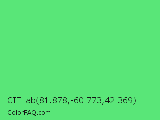 CIELab 81.878,-60.773,42.369 Color is a light green color and the nearest color is Very Light Malachite Green #64e986. Hex code #59e678 and RGB value is rgb(89,230,120). In RGB color space, this color is composed of 35% red, 90% green, 47% blue, In CMYK color space, this color is composed of 61% cyan, 0% magenta, 48% yellow , 10% black , In HSL color space, this color has a hue angle of 133° , 74% saturation and 63% lightness.