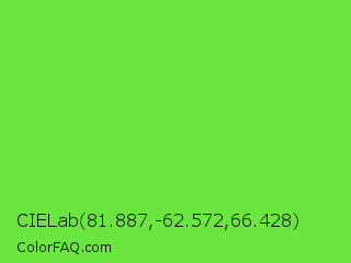 CIELab 81.887,-62.572,66.428 Color is a normal green color and the nearest color is Kiwi #8ee53f. Hex code #6be640 and RGB value is rgb(107,230,64). In RGB color space, this color is composed of 42% red, 90% green, 25% blue, In CMYK color space, this color is composed of 53% cyan, 0% magenta, 72% yellow , 10% black , In HSL color space, this color has a hue angle of 104° , 77% saturation and 58% lightness.
