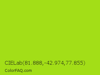 CIELab 81.888,-42.974,77.855 Color is a normal lime color and the nearest color is Inch Worm #b0e313. Hex code #a3de17 and RGB value is rgb(163,222,23). In RGB color space, this color is composed of 64% red, 87% green, 9% blue, In CMYK color space, this color is composed of 27% cyan, 0% magenta, 90% yellow , 13% black , In HSL color space, this color has a hue angle of 78° , 81% saturation and 48% lightness.