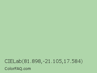 CIELab 81.898,-21.105,17.584 Color is a light green color and the nearest color is Moss Green #addfad. Hex code #afd6aa and RGB value is rgb(175,214,170). In RGB color space, this color is composed of 69% red, 84% green, 67% blue, In CMYK color space, this color is composed of 18% cyan, 0% magenta, 21% yellow , 16% black , In HSL color space, this color has a hue angle of 113° , 35% saturation and 75% lightness.