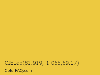 CIELab 81.919,-1.065,69.17 Color is a normal yellow color and the nearest color is Sandstorm #ecd540. Hex code #edc940 and RGB value is rgb(237,201,64). In RGB color space, this color is composed of 93% red, 79% green, 25% blue, In CMYK color space, this color is composed of 0% cyan, 15% magenta, 73% yellow , 7% black , In HSL color space, this color has a hue angle of 48° , 83% saturation and 59% lightness.