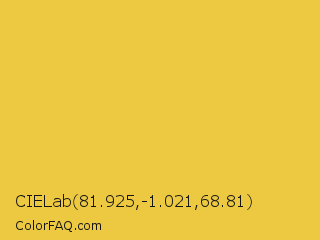 CIELab 81.925,-1.021,68.81 Color is a normal yellow color and the nearest color is Sandstorm #ecd540. Hex code #edc941 and RGB value is rgb(237,201,65). In RGB color space, this color is composed of 93% red, 79% green, 25% blue, In CMYK color space, this color is composed of 0% cyan, 15% magenta, 73% yellow , 7% black , In HSL color space, this color has a hue angle of 47° , 83% saturation and 59% lightness.