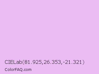 CIELab 81.925,26.353,-21.321 Color is a very light purple color and the nearest color is French Lilac #ecc7ee. Hex code #ebbcf4 and RGB value is rgb(235,188,244). In RGB color space, this color is composed of 92% red, 74% green, 96% blue, In CMYK color space, this color is composed of 4% cyan, 23% magenta, 0% yellow , 4% black , In HSL color space, this color has a hue angle of 290° , 72% saturation and 85% lightness.