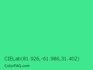 CIELab 81.926,-61.986,31.402 Color is a normal green color and the nearest color is Eucalyptus #44d7a8. Hex code #3fe78e and RGB value is rgb(63,231,142). In RGB color space, this color is composed of 25% red, 91% green, 56% blue, In CMYK color space, this color is composed of 73% cyan, 0% magenta, 39% yellow , 9% black , In HSL color space, this color has a hue angle of 148° , 78% saturation and 58% lightness.