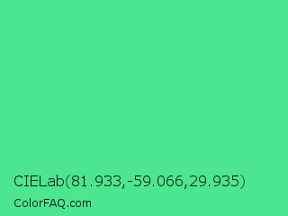 CIELab 81.933,-59.066,29.935 Color is a normal green color and the nearest color is Very Light Malachite Green #64e986. Hex code #4ce691 and RGB value is rgb(76,230,145). In RGB color space, this color is composed of 30% red, 90% green, 57% blue, In CMYK color space, this color is composed of 67% cyan, 0% magenta, 37% yellow , 10% black , In HSL color space, this color has a hue angle of 147° , 75% saturation and 60% lightness.