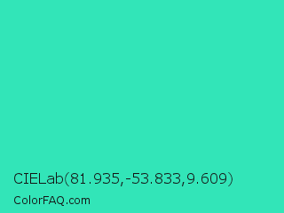 CIELab 81.935,-53.833,9.609 Color is a normal cyan color and the nearest color is Turquoise PWG #30d5c8. Hex code #32e5b8 and RGB value is rgb(50,229,184). In RGB color space, this color is composed of 20% red, 90% green, 72% blue, In CMYK color space, this color is composed of 78% cyan, 0% magenta, 20% yellow , 10% black , In HSL color space, this color has a hue angle of 165° , 77% saturation and 55% lightness.