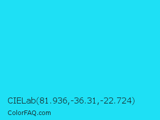 CIELab 81.936,-36.31,-22.724 Color is a normal cyan color and the nearest color is Loeen #15f2fd. Hex code #1ee0f5 and RGB value is rgb(30,224,245). In RGB color space, this color is composed of 12% red, 88% green, 96% blue, In CMYK color space, this color is composed of 88% cyan, 9% magenta, 0% yellow , 4% black , In HSL color space, this color has a hue angle of 186° , 91% saturation and 54% lightness.