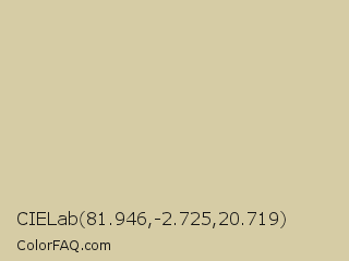 CIELab 81.946,-2.725,20.719 Color is a light yellow color and the nearest color is Akaroa #d4c4a8. Hex code #d6cca5 and RGB value is rgb(214,204,165). In RGB color space, this color is composed of 84% red, 80% green, 65% blue, In CMYK color space, this color is composed of 0% cyan, 5% magenta, 23% yellow , 16% black , In HSL color space, this color has a hue angle of 48° , 37% saturation and 74% lightness.