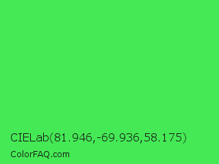 CIELab 81.946,-69.936,58.175 Color is a normal green color and the nearest color is UFO Green #3cd070. Hex code #45e955 and RGB value is rgb(69,233,85). In RGB color space, this color is composed of 27% red, 91% green, 33% blue, In CMYK color space, this color is composed of 70% cyan, 0% magenta, 64% yellow , 9% black , In HSL color space, this color has a hue angle of 126° , 79% saturation and 59% lightness.