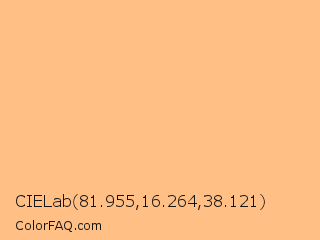 CIELab 81.955,16.264,38.121 Color is a light orange color and the nearest color is Macaroni And Cheese #ffbd88. Hex code #ffbf85 and RGB value is rgb(255,191,133). In RGB color space, this color is composed of 100% red, 75% green, 52% blue, In CMYK color space, this color is composed of 0% cyan, 25% magenta, 48% yellow , 0% black , In HSL color space, this color has a hue angle of 29° , 100% saturation and 76% lightness.