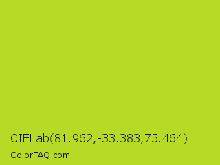 CIELab 81.962,-33.383,75.464 Color is a normal lime color and the nearest color is Key Lime Pie #bfc921. Hex code #b6da26 and RGB value is rgb(182,218,38). In RGB color space, this color is composed of 71% red, 85% green, 15% blue, In CMYK color space, this color is composed of 17% cyan, 0% magenta, 83% yellow , 15% black , In HSL color space, this color has a hue angle of 72° , 71% saturation and 50% lightness.