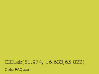 CIELab 81.974,-16.633,65.822 Color is a normal yellow color and the nearest color is Wattle #dcd747. Hex code #d2d247 and RGB value is rgb(210,210,71). In RGB color space, this color is composed of 82% red, 82% green, 28% blue, In CMYK color space, this color is composed of 0% cyan, 0% magenta, 66% yellow , 18% black , In HSL color space, this color has a hue angle of 60° , 61% saturation and 55% lightness.