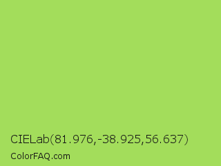 CIELab 81.976,-38.925,56.637 Color is a light green color and the nearest color is Conifer #acdd4d. Hex code #a3dd5b and RGB value is rgb(163,221,91). In RGB color space, this color is composed of 64% red, 87% green, 36% blue, In CMYK color space, this color is composed of 26% cyan, 0% magenta, 59% yellow , 13% black , In HSL color space, this color has a hue angle of 87° , 66% saturation and 61% lightness.