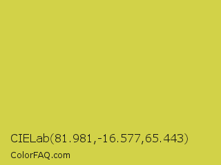 CIELab 81.981,-16.577,65.443 Color is a normal yellow color and the nearest color is Wattle #dcd747. Hex code #d2d248 and RGB value is rgb(210,210,72). In RGB color space, this color is composed of 82% red, 82% green, 28% blue, In CMYK color space, this color is composed of 0% cyan, 0% magenta, 66% yellow , 18% black , In HSL color space, this color has a hue angle of 60° , 61% saturation and 55% lightness.