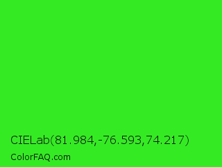 CIELab 81.984,-76.593,74.217 Color is a normal green color and the nearest color is Neon Green #39ff14. Hex code #34eb23 and RGB value is rgb(52,235,35). In RGB color space, this color is composed of 20% red, 92% green, 14% blue, In CMYK color space, this color is composed of 78% cyan, 0% magenta, 85% yellow , 8% black , In HSL color space, this color has a hue angle of 115° , 83% saturation and 53% lightness.