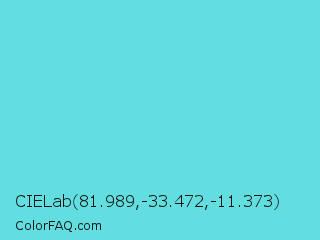 CIELab 81.989,-33.472,-11.373 Color is a light cyan color and the nearest color is Turquoise Blue #6cdae7. Hex code #63dee0 and RGB value is rgb(99,222,224). In RGB color space, this color is composed of 39% red, 87% green, 88% blue, In CMYK color space, this color is composed of 56% cyan, 1% magenta, 0% yellow , 12% black , In HSL color space, this color has a hue angle of 181° , 67% saturation and 63% lightness.