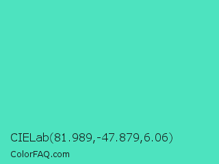 CIELab 81.989,-47.879,6.06 Color is a normal cyan color and the nearest color is Turquoise #40e0d0. Hex code #4de3bf and RGB value is rgb(77,227,191). In RGB color space, this color is composed of 30% red, 89% green, 75% blue, In CMYK color space, this color is composed of 66% cyan, 0% magenta, 16% yellow , 11% black , In HSL color space, this color has a hue angle of 166° , 73% saturation and 60% lightness.