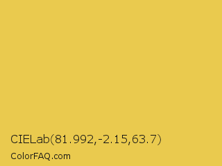 CIELab 81.992,-2.15,63.7 Color is a light yellow color and the nearest color is Ronchi #ecc54e. Hex code #eaca4e and RGB value is rgb(234,202,78). In RGB color space, this color is composed of 92% red, 79% green, 31% blue, In CMYK color space, this color is composed of 0% cyan, 14% magenta, 67% yellow , 8% black , In HSL color space, this color has a hue angle of 48° , 79% saturation and 61% lightness.