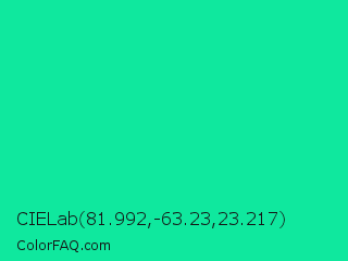 CIELab 81.992,-63.23,23.217 Color is a normal green color and the nearest color is Medium Spring Green #00fa9a. Hex code #0fe89e and RGB value is rgb(15,232,158). In RGB color space, this color is composed of 6% red, 91% green, 62% blue, In CMYK color space, this color is composed of 94% cyan, 0% magenta, 32% yellow , 9% black , In HSL color space, this color has a hue angle of 160° , 88% saturation and 48% lightness.