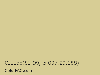 CIELab 81.99,-5.007,29.188 Color is a light yellow color and the nearest color is Winter Hazel #d5d195. Hex code #d7cd95 and RGB value is rgb(215,205,149). In RGB color space, this color is composed of 84% red, 80% green, 58% blue, In CMYK color space, this color is composed of 0% cyan, 5% magenta, 31% yellow , 16% black , In HSL color space, this color has a hue angle of 51° , 45% saturation and 71% lightness.