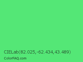 CIELab 82.025,-62.434,43.489 Color is a light green color and the nearest color is Very Light Malachite Green #64e986. Hex code #54e776 and RGB value is rgb(84,231,118). In RGB color space, this color is composed of 33% red, 91% green, 46% blue, In CMYK color space, this color is composed of 64% cyan, 0% magenta, 49% yellow , 9% black , In HSL color space, this color has a hue angle of 134° , 75% saturation and 62% lightness.