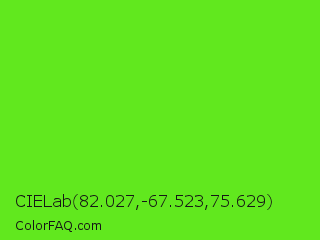 CIELab 82.027,-67.523,75.629 Color is a normal green color and the nearest color is Bright Green #66ff00. Hex code #61e81e and RGB value is rgb(97,232,30). In RGB color space, this color is composed of 38% red, 91% green, 12% blue, In CMYK color space, this color is composed of 58% cyan, 0% magenta, 87% yellow , 9% black , In HSL color space, this color has a hue angle of 100° , 81% saturation and 51% lightness.