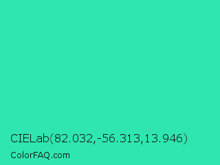 CIELab 82.032,-56.313,13.946 Color is a normal green color and the nearest color is Eucalyptus #44d7a8. Hex code #30e6b0 and RGB value is rgb(48,230,176). In RGB color space, this color is composed of 19% red, 90% green, 69% blue, In CMYK color space, this color is composed of 79% cyan, 0% magenta, 23% yellow , 10% black , In HSL color space, this color has a hue angle of 162° , 78% saturation and 55% lightness.
