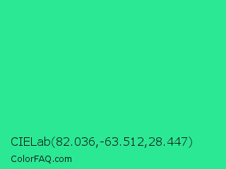 CIELab 82.036,-63.512,28.447 Color is a normal green color and the nearest color is Shamrock #33cc99. Hex code #2be894 and RGB value is rgb(43,232,148). In RGB color space, this color is composed of 17% red, 91% green, 58% blue, In CMYK color space, this color is composed of 81% cyan, 0% magenta, 36% yellow , 9% black , In HSL color space, this color has a hue angle of 153° , 80% saturation and 54% lightness.