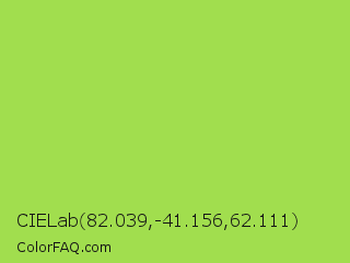CIELab 82.039,-41.156,62.111 Color is a normal green color and the nearest color is Conifer #acdd4d. Hex code #a1de4e and RGB value is rgb(161,222,78). In RGB color space, this color is composed of 63% red, 87% green, 31% blue, In CMYK color space, this color is composed of 27% cyan, 0% magenta, 65% yellow , 13% black , In HSL color space, this color has a hue angle of 85° , 69% saturation and 59% lightness.