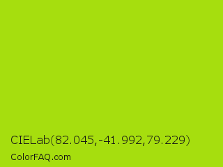 CIELab 82.045,-41.992,79.229 Color is a normal lime color and the nearest color is Vivid Lime Green #a6d608. Hex code #a6de0e and RGB value is rgb(166,222,14). In RGB color space, this color is composed of 65% red, 87% green, 5% blue, In CMYK color space, this color is composed of 25% cyan, 0% magenta, 94% yellow , 13% black , In HSL color space, this color has a hue angle of 76° , 88% saturation and 46% lightness.