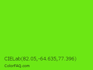 CIELab 82.05,-64.635,77.396 Color is a normal green color and the nearest color is Alien Armpit #84de02. Hex code #6ce714 and RGB value is rgb(108,231,20). In RGB color space, this color is composed of 42% red, 91% green, 8% blue, In CMYK color space, this color is composed of 53% cyan, 0% magenta, 91% yellow , 9% black , In HSL color space, this color has a hue angle of 95° , 84% saturation and 49% lightness.