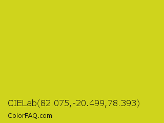 CIELab 82.075,-20.499,78.393 Color is a normal yellow color and the nearest color is Bird Flower #d4cd16. Hex code #cfd41c and RGB value is rgb(207,212,28). In RGB color space, this color is composed of 81% red, 83% green, 11% blue, In CMYK color space, this color is composed of 2% cyan, 0% magenta, 87% yellow , 17% black , In HSL color space, this color has a hue angle of 62° , 77% saturation and 47% lightness.